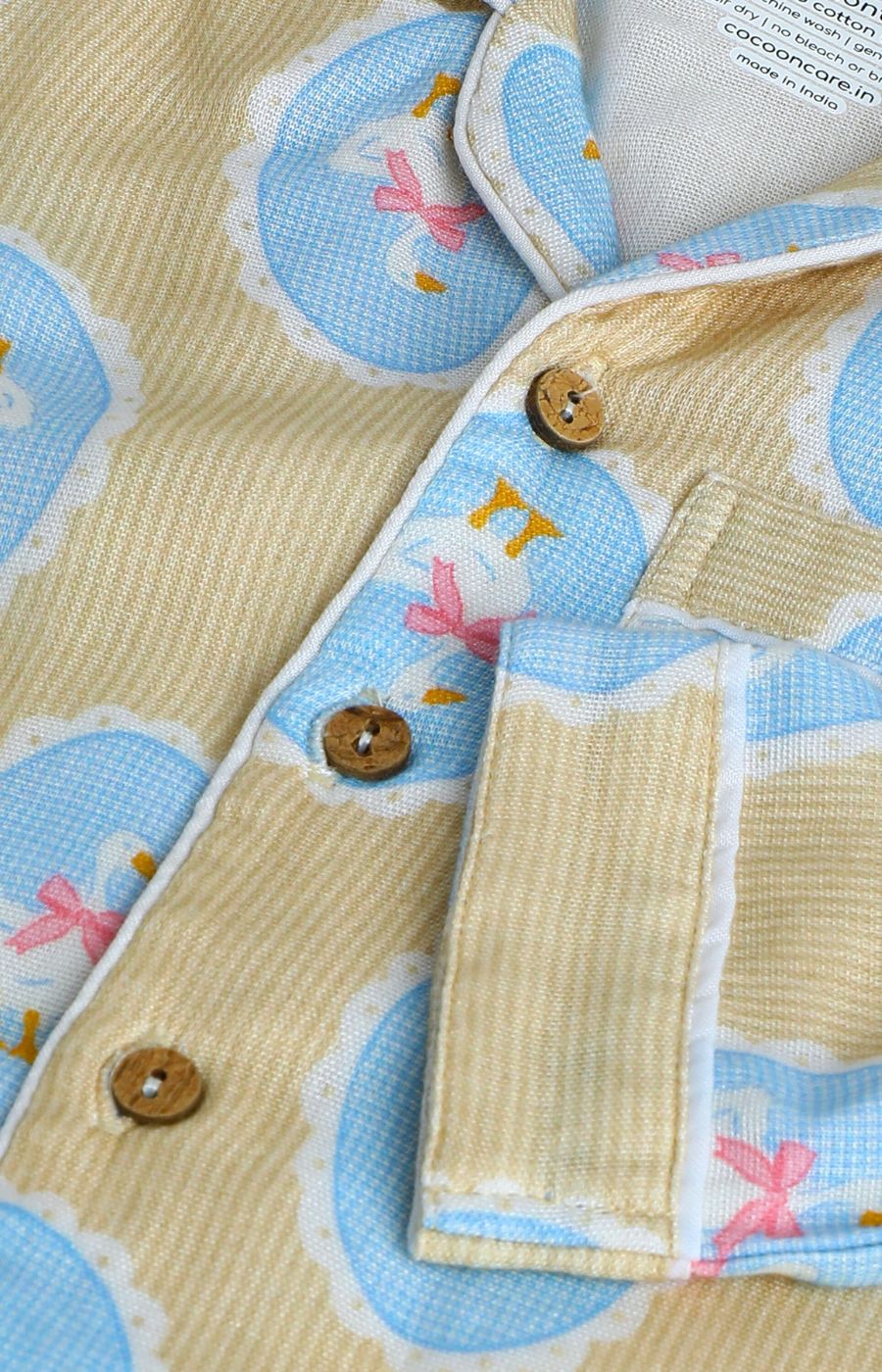 CocoonCare’s bamboo muslin nightwear for kids is a perfect addition to the newborn baby collection. They are designed to provide safe and cosy nights for your little ones. Made from the finest bamboo muslin fabric, they are non-irritant and hypoallergenic. Our bamboo night suit sets feature snap buttons for easy changing and an elastic waist design that is very soft on little tummies, leaving no marks. These muslin infant night suits are also diaper-friendly and make nighttime diaper changes much easier. With cute collars, little pockets and adorable prints this muslin night dress for kids gives them a cute bedtime look and ensures peaceful sleep at night.